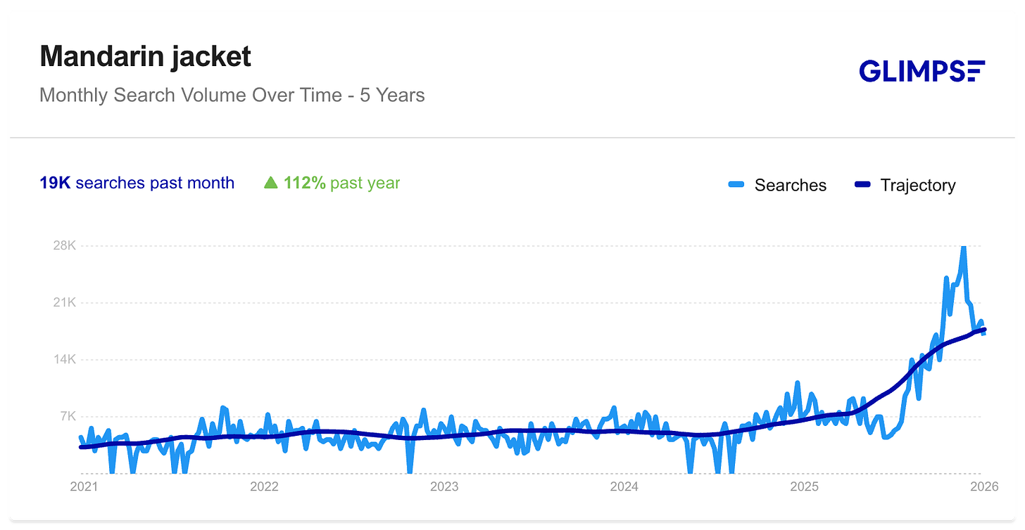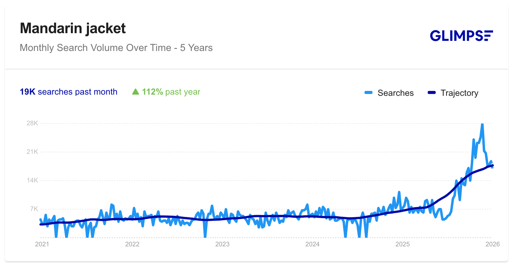 So — while Mandarin jackets don’t technically exist, they have continued to be an ‘2026 it-girl staple’ as some publications have put it — garnering 19k searches in the past month, up 112% in the past year.